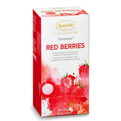 RED BERRIES – saldžios prinokusios uogos suteikia nuostabų vaisių aromatą. „Ronnefeldt“ – vieni seniausių pasaulyje arbatos gamintojų, kurių produkciją renkasi išskirtinės kavinės, restoranai ir viešbučiai visame pasaulyje. Kruopščiai atrinktos arbatžolės apdorojamos senuoju tradiciniu būdu – rankomis. Būtent taip užtikrinamas rafinuotas, subtilus ir išskirtinis skonis kuriuo visame pasaulyje ir garsėja šis prekinis ženklas gyvuojantis nuo 1823 metų. Paketėliai puikiai išlaiko arbatos skonį bei aromatą ir apsaugo ją nuo drėgmės. Arbata išsaugo visas skonio, kuriuo ją apdovanojo gamta, subtilybes. Maišelių popierius turi dideles poras, todėl arbatos lapeliai visiškai pasineria į vandenį, o juostelė pritvirtinta nenaudojant jokių metalinių spaustukų. Taigi gardžiuodamiesi įvairių rūšių „Ronnefeldt“ arbata, galėsite įvertinti visus šiuos pranašumus. Pakuotė talpina 25 vnt. arbatos pakelių. Lapų rūšis: smulkinti; Sudedamosios dalys: obuoliai, kinrožės, kvapioji medžiaga – citrinų rūgštis, erškėtuogių žievelė; Paruošimas: užpilti verdančiu vandeniu (100 °C) ir palaikyti bent 5 minutes. Laikyti sausoje, švarioje, gerai vėdinamoje patalpoje. Arbatos mišinys pagamintas Vokietijoje.