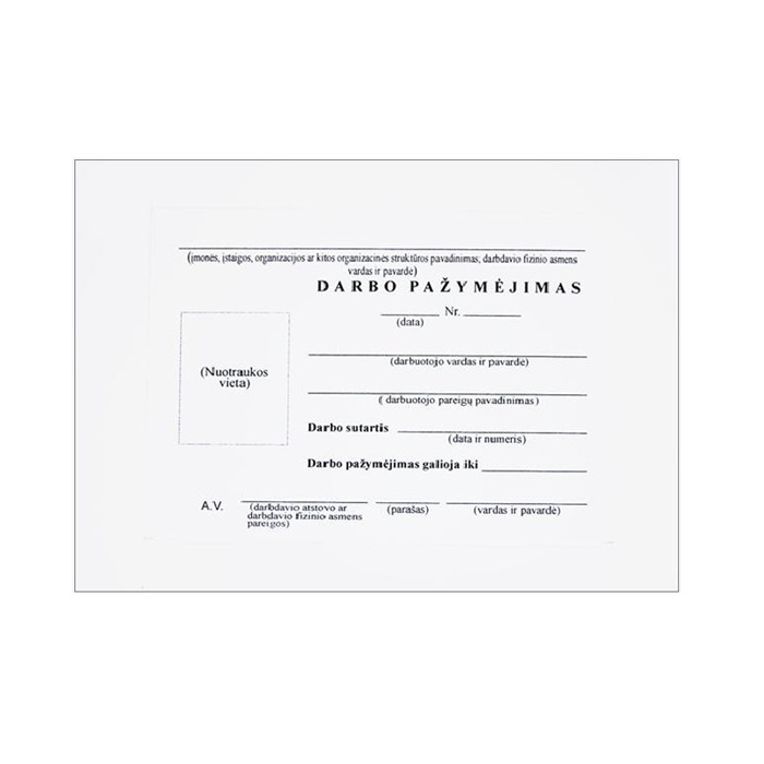 Darbo pažymėjimas. A7 formatas. Storis: 170 g/m2 ofsetinis popierius.