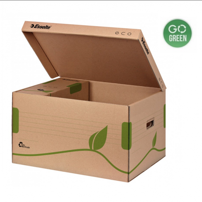 Dėžė archyvavimo. Pagaminta iš 100% perdirbto gofruoto kartono. Galima naudoti kaip transportavimo dėžę. Stipri konstrukcija dėl sustiprintų šonų. Lengva sudėti, nes sulankstymo instrukcija atspausdinta ant pačios dėžutės. Su dangčiu. Telpa 4 Eco 100 mm pločio dėžutės, arba 5 Eco 80 mm pločio dėžutės. Matmenys: 439 x 242 x 345 mm.