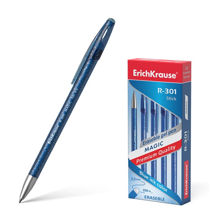 Ištrinamas gelinis rašiklis R-301 MAGIC GEL, ErichKrause, storis 0.5 mm, mėlynos sp. Šerdelės galiuko storis 0.5 mm, brėžio storis 0.4 mm, rašymo ilgis iki 200 metrų, gelio spalvos korpusas, su plastikiniu trintuku, su kamšteliu, keičiama šerdelė, mėlynos spalvos ištrinamas gelis.