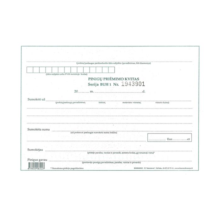Pinigų priėmimo kvitas. Su Nr. A6 formato. 50 komplektų x 2 lapai.