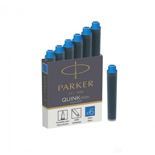 Trumpos rašalo kapsulės PARKER QUINK mini. Mėlynos spalvos. Tinka visiems PARKER parkeriams. Dėžutėje: 6 vnt.