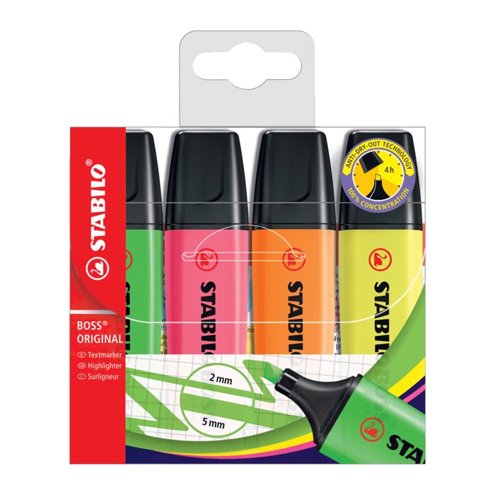 STABILO BOSS žymeklis yra klasikinis mėgstamiausias ir nuo 1971 m. geriausiai parduodamas žymeklis Europoje. Anti-Dry-Out technologija: 4 valandų apsauga nuo išdžiūvimo. 2 brėžio linijų storiai – 2mm ir 5mm. Idealiai tinka paryškinti įvairaus dydžio tekstus, taip pat piešti skirtingo storio linijas. Rašalas vandens pagrindu. Tvirta konstrukcijos kokybė reiškia, kad antgalis tarnaus labai ilgai. Rinkinyje 4 spalvos.